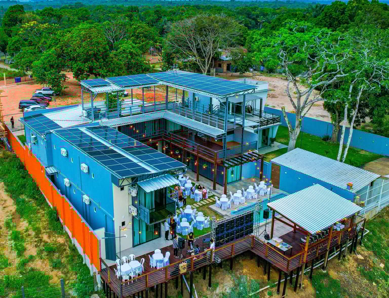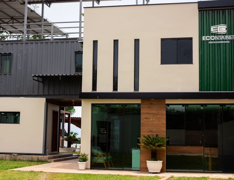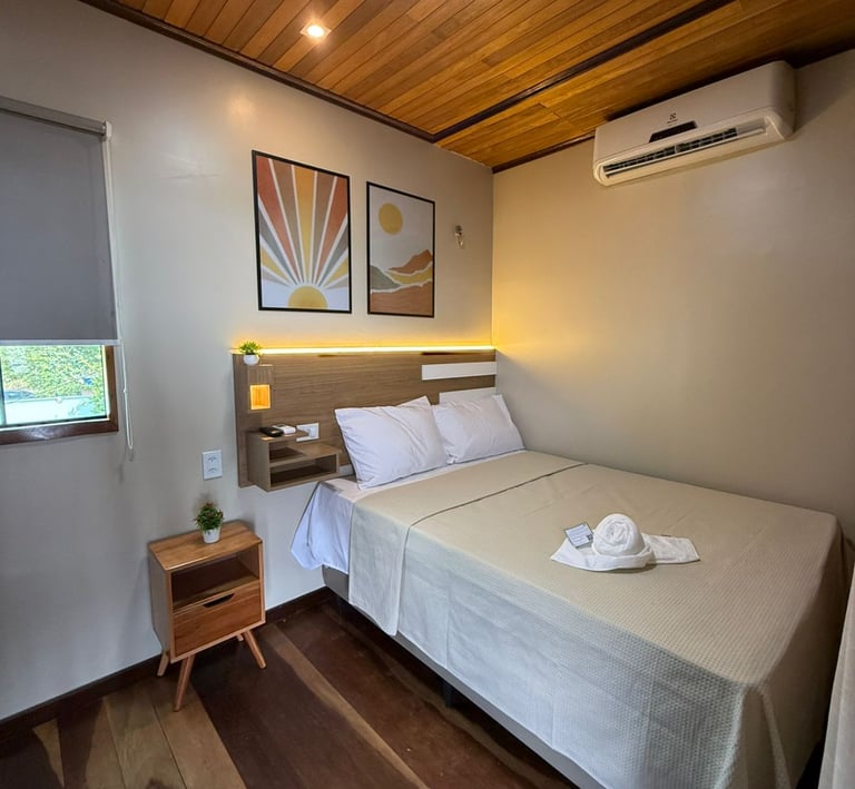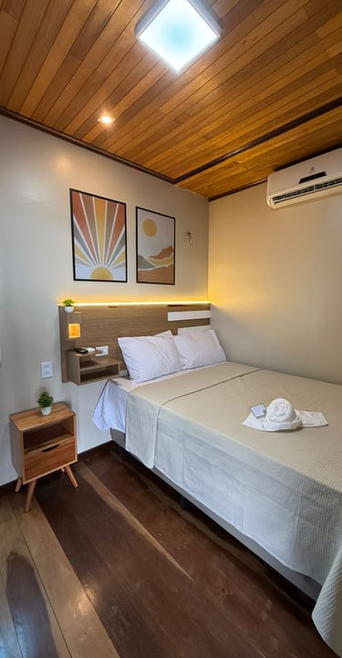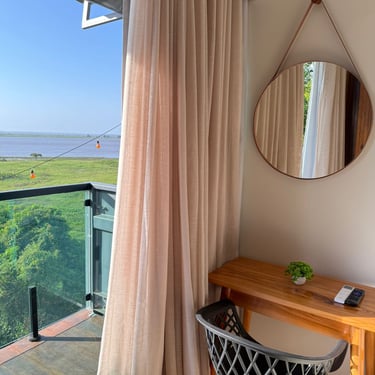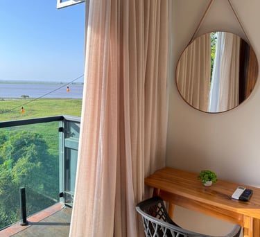 Quarto aconchegante com vista direta para o rio, decoração natural e conforto moderno.